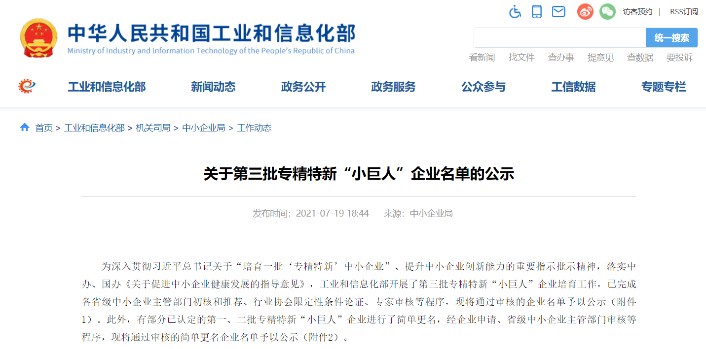 7月19日,工業(yè)和信息化部中小企業(yè)局發(fā)布了《關(guān)于第三批專精特新“小巨人”企業(yè)名單的公示》,寶太生物上榜!
